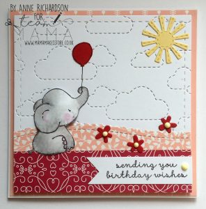 Stick the elephant to the card adding some foam pads or silicone glue in the centre to give dimension. Stamp the balloon onto coloured card and cut out. Stick this in place and add the string with a fine line black pen. Finish with a die cut sun and some flowers.
