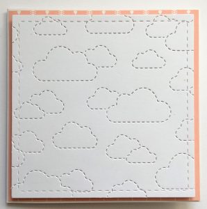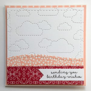 Cut a piece of white card with the cloud backdrop die and trim to 10cm square. Layer this onto a piece of patterned paper and stick to the front of an 11cm square card base.