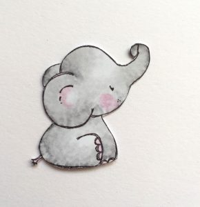 Stamp and colour the elephant then fussy cut around the outside edge. It’s easier to cut away the balloon at this stage.