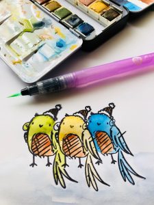 I started by stamping three birds using a mask to make the birds sit behind each other . I then used my watercolours to colour the birds a different colour and shaded below them .