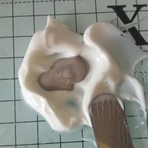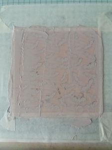 2. Mix some Ranger transparent gloss texture paste with hickory smoke distress oxide reinker. Using a spatula spread this evenly through the stencil. Remove the stencil and wash immediately in warm soapy water. Leave the background piece to dry.