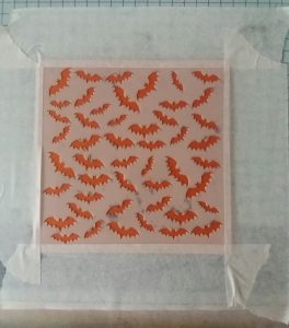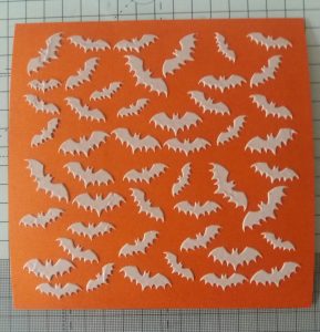 1. Cut a piece of orange card into a 6 inch square. Tape the card and Bee Crafty’s bat inkable stencil to your work surface.