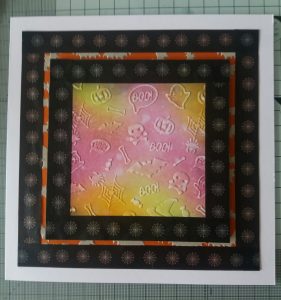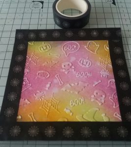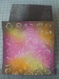 4. Using a Halloween themed embossing folder, emboss this background piece. Sand it back lightly with a sanding block. This makes the embossed images stand out more.