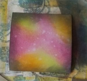 3. Cut a piece of white card to 4.5 inches square and using twisted citron, seedless preserve, spiced pumpkin and black soot distress oxides create a background. Spray this lightly with water and pat dry with kitchen roll.