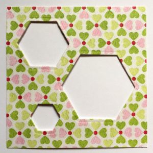 2. Use one of these pieces as a template to mark the position of the windows on a square of white card and then stamp the sentiments in the centre of each hexagon.