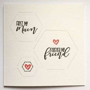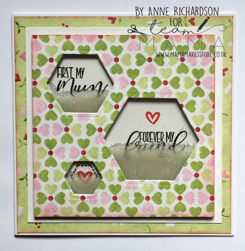 Supplies; Mama Makes family sentiments, Mama Makes hexagon heaven, black ink, red ink, white card, acetate, micro beads, nesting hexagon dies, patterned paper, foam sheet, red liner tape