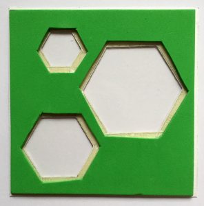 1. Cut 3 different sized hexagons from a 12cm square of patterned paper and cut an identical piece from a foam sheet.