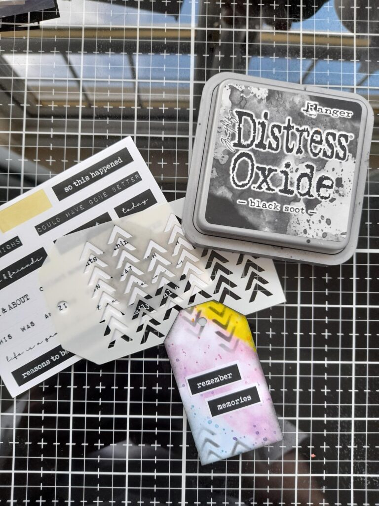 `Take one of the tags from the kit, and blend some Black Soot through the stencil, then blend some ink around the edges. Add a couple of words from the sticker sheet.