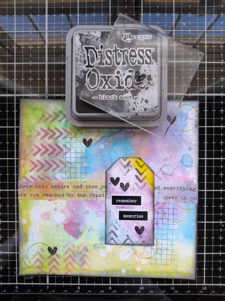 Use Black Soot to stamp a few hearts randomly over the background and the tag.