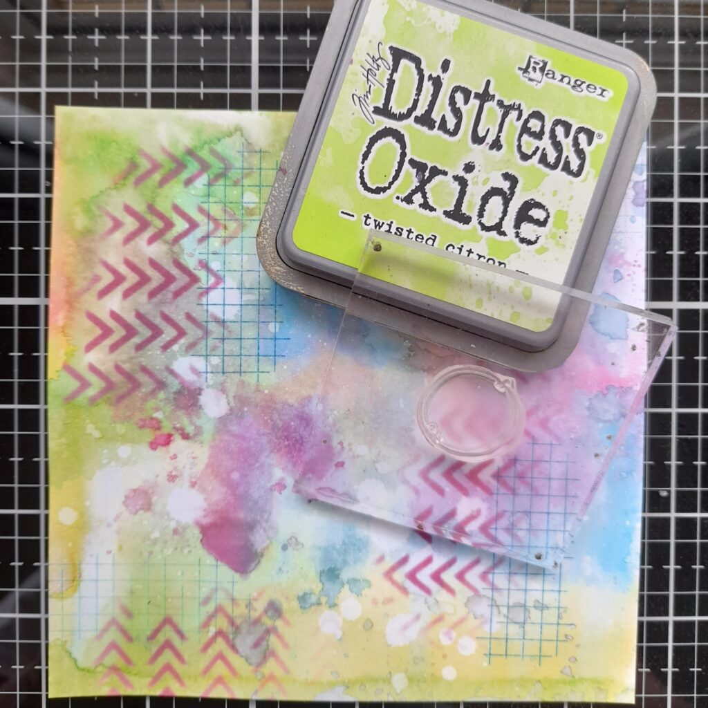 Use Twisted Citron Distress Oxide to randomly stamp circles over the background.