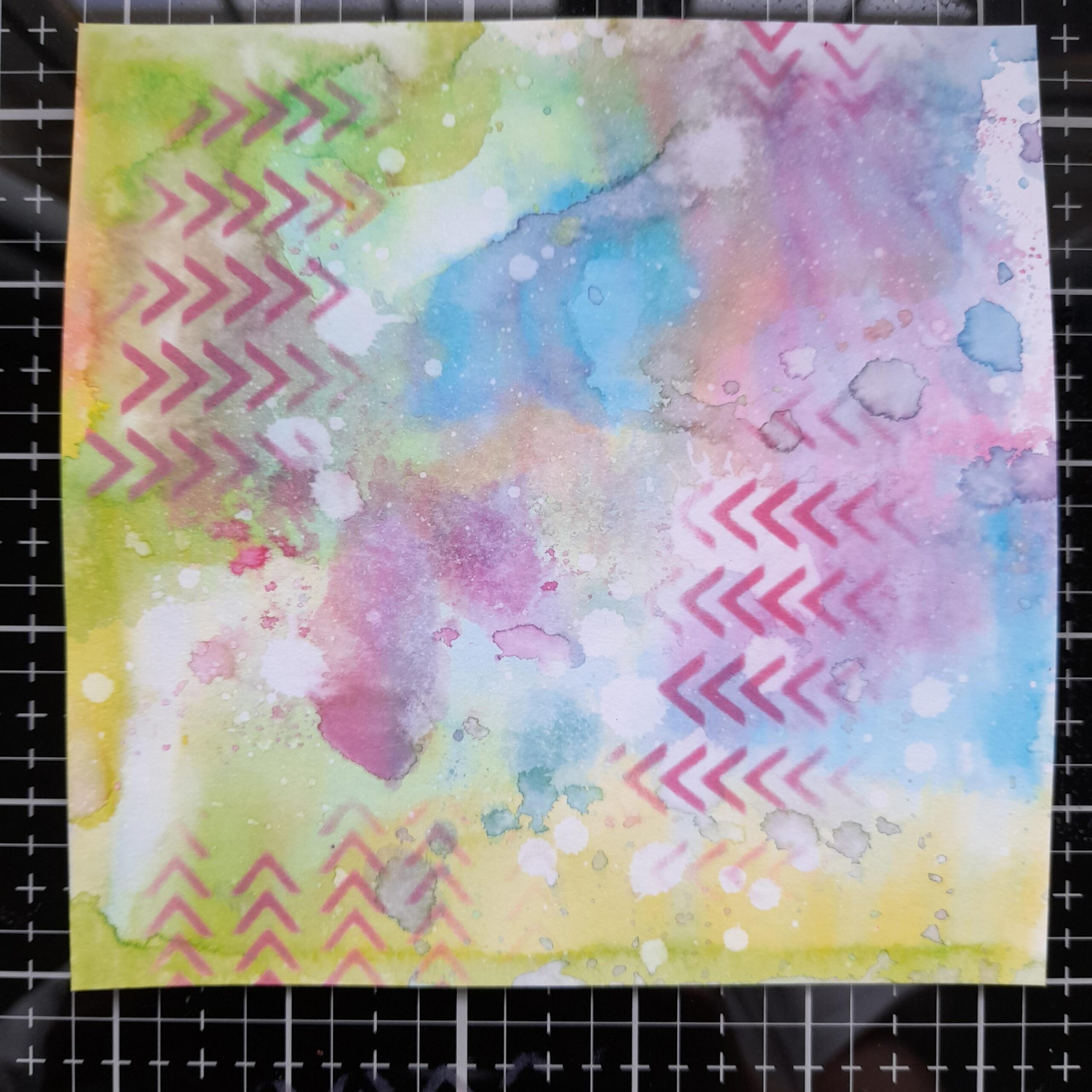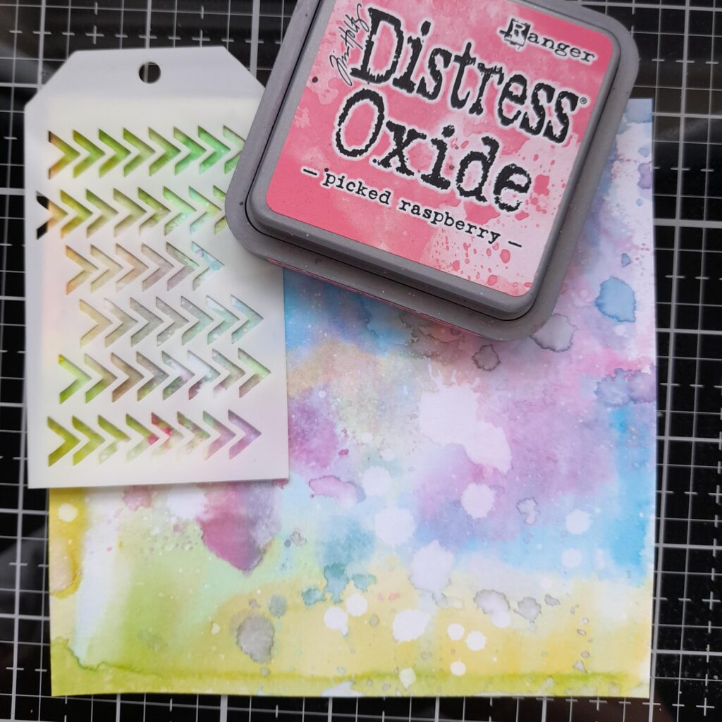 Take the stencil from the kit and blend some Picked Raspberry through it randomly over the background.