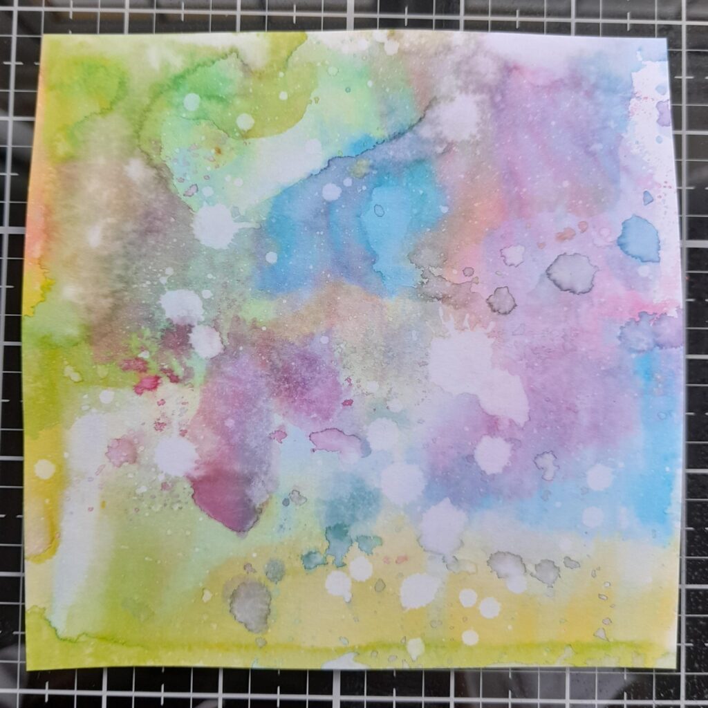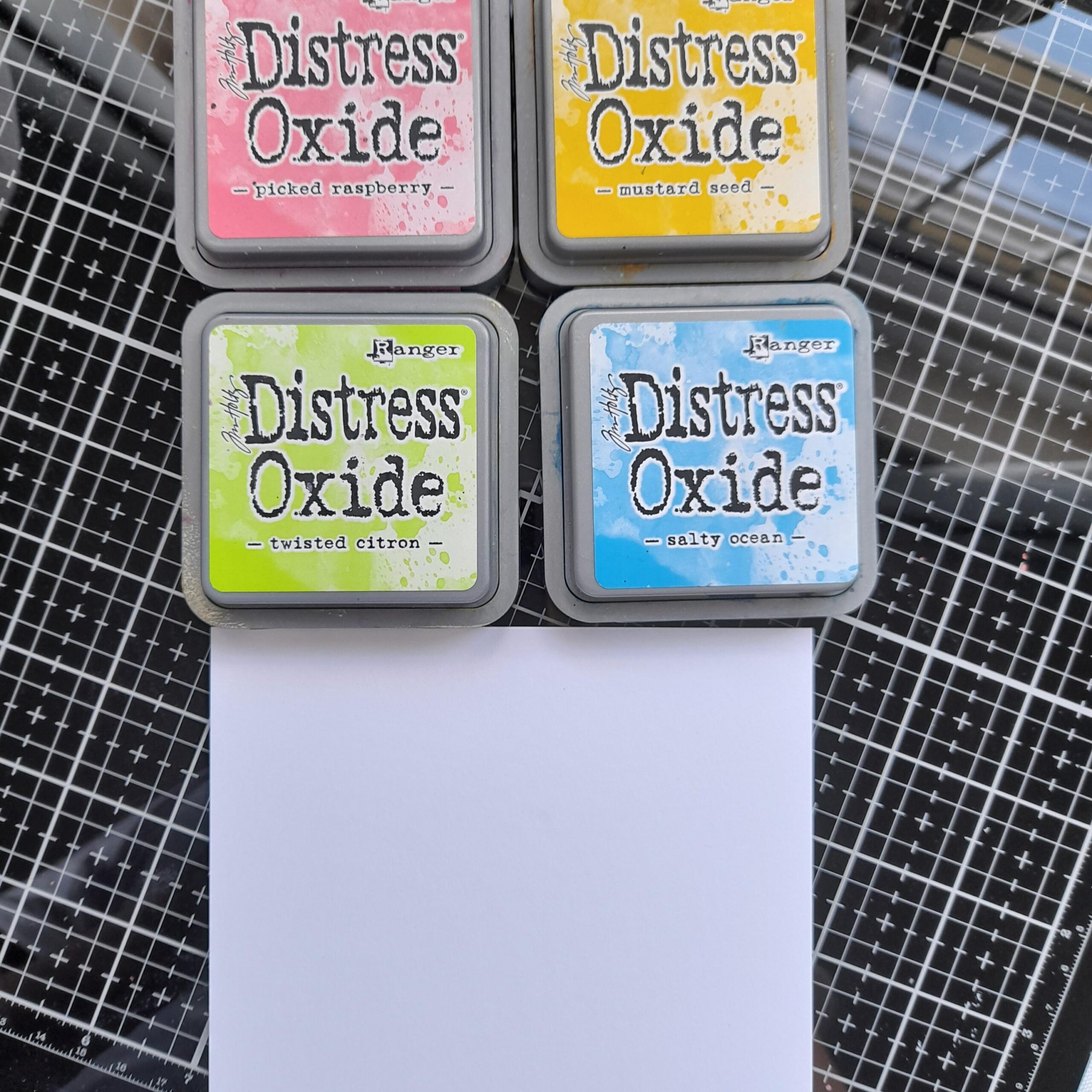Cut a piece of white card to 5 1/2″ square and select some Distress Oxides (Twisted Citron, Salty Ocean, Picked Raspberry, Mustard Seed).