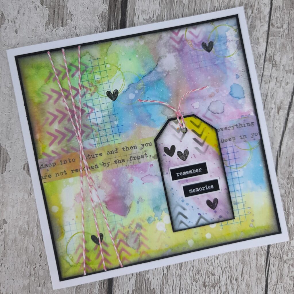 Tie some twine around the background, and mat to a piece of black card slightly larger and then affix to the card blank (6″ square white). Finish by matting the tag to some black card, tie some twine around the top and affix with foam pads