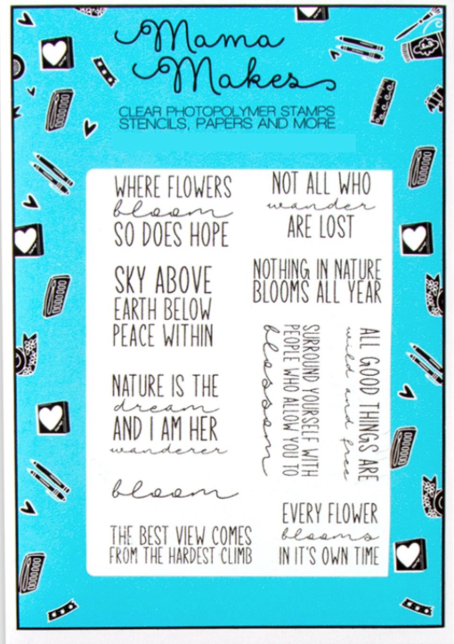 The Mama Makes Bloom Words stamp set features 10 stamps in total with botanical themed inspirational sentiments designed by Loti Maria.