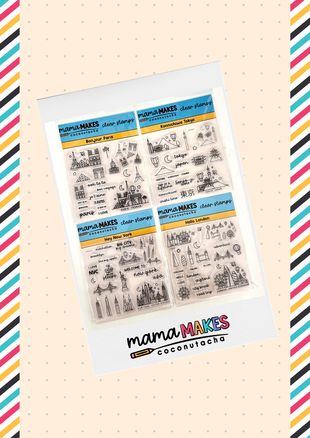 | Stamp Set | Hello London, Hey New York, Bonjour Paris, Konnichiwa Tokyo, All Four Travel Sets |