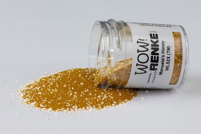 A deep rich honey colour powder with white flecks in it, making every embossed design different.