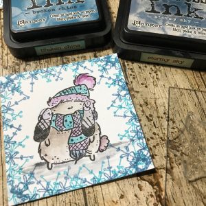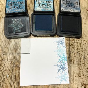 I used the snowflake from the stamp set in contrasting blue tones of distress ink to