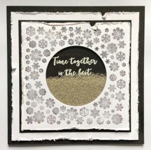 Stamp and heat emboss your sentiment in the centre of a piece of black card, line up in the window and trim to fit. Sprinkle a pile of beads in the centre and stick the top piece onto it making sure there is glue on the foam layer all around the aperture to keep the beads inside.