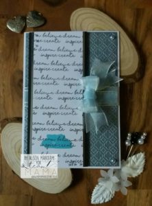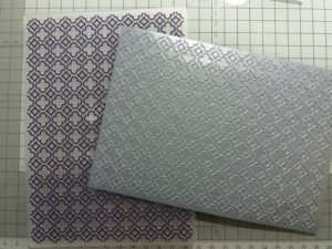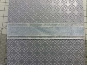 Then I cut a piece of silver pearlescent card to 6.75 inches by 4.75 inches. I used a 5 x 7 inch embossing folder to emboss a pattern. I used Card Making Magic’s Quatrefoil folder. I wrapped two pieces of ribbon around this piece and stuck down on the reverse. I then mounted this on to a 5 x 7 inch card.